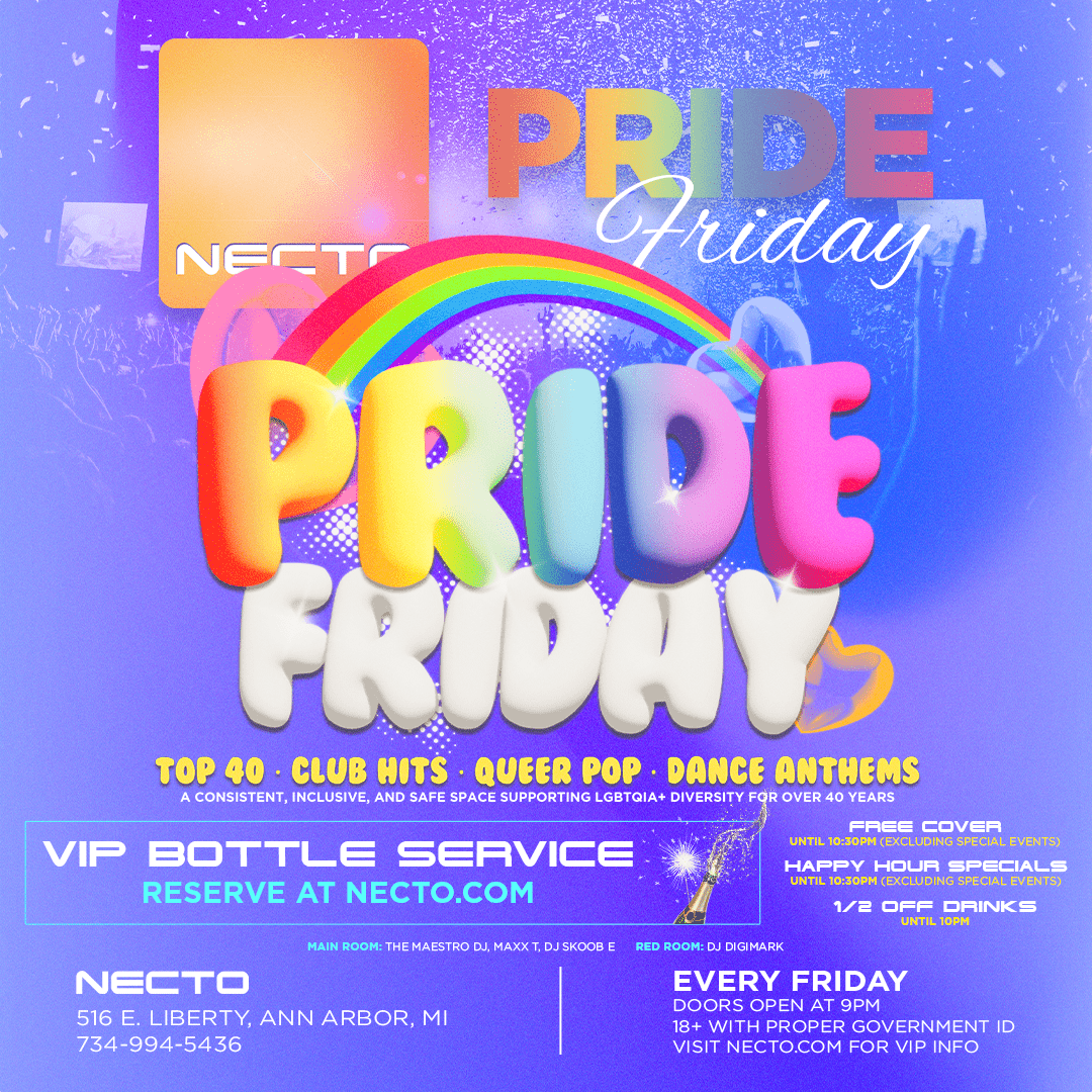 Necto Pride has been running every Friday nonstop since 1984! We are thrilled to create a safe, inclusive space for the LGBTQA+ community and allies to come together to celebrate. Necto Pride features a vibrant atmosphere, complete with pulsating lights and a state-of-the-art sound system that will keep you moving all night long.